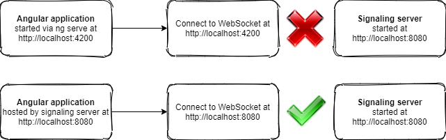 We will need to make sure the Angular project is hosted by the signaling server for it to construct the correct WebSocket URL because we set the WebSocket to connect to the same server that host the Angular application.