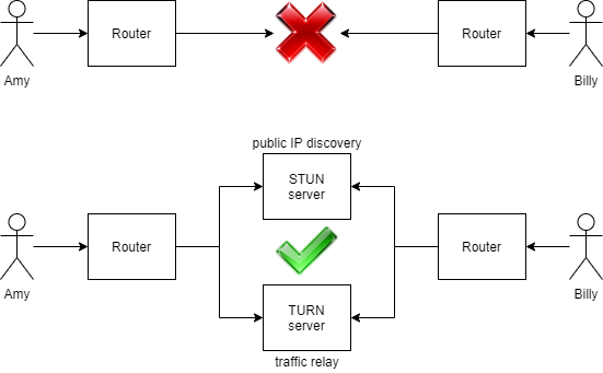 WebRTC works on p2p connection but that's not so possible given all people is behind some router nowdays. Thus, we need the STUN server for public IP discovery and TURN server to relay the traffic between the participants behind the router.