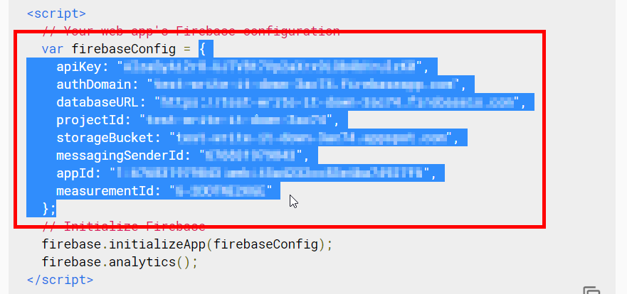 Now you should see some Javascript code to setup the Firebase. We just need to firebaseConfig . Copy the content between { and }.